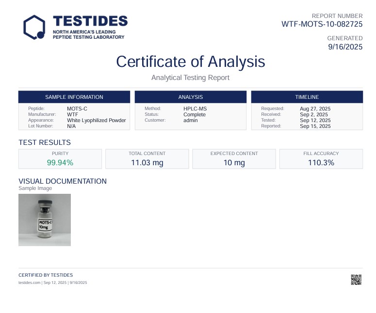 MOTS-c is a mitochondrial-derived peptide (encoded in mitochondrial DNA) that regulates cellular energy metabolism, mimicking exercise effects by activating AMPK pathways to improve glucose uptake and fat oxidation.